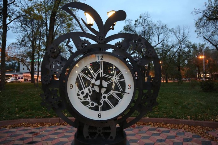 По идее создателей, "механическое яблоко" отражает динамично развивающийся город, в котором каждый житель, как неотъемлемая деталь механизма, приводит в движение мегаполис, изображенный в образе яблока. Также это уличные часы.