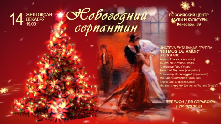 Жителей Астаны ожидает интересное мероприятие. 14 декабря вниманию публики будет представлен концерт "Новогодний серпантин", который пройдет в Российском центре науки и культуры. В концерте принимают участие яркая солистка театра "Астана Опера" Малика Минизини и звездный инструментальный ансамбль Ritmos de amor. Концертмейстером станет Елена Сахно.