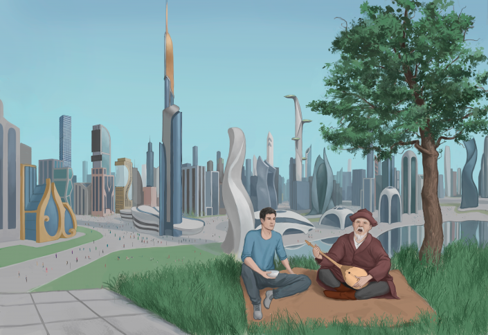 Ерлик Жарылгапов также уделил внимание людям будущего. Судя по его рисунку, в Казахстане будущего по-прежнему любят мотивы домбры и чаепитие.
