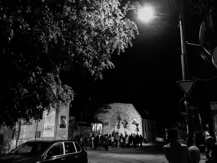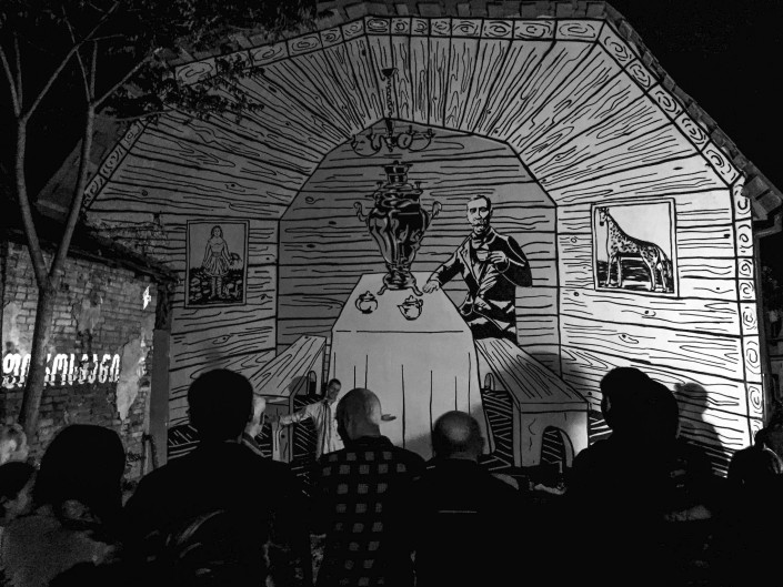 На открытие нового арт-объекта Паша Кас пригласил уличных музыкантов, установил проектор с кадрами из художественного фильма о Пиросмани.