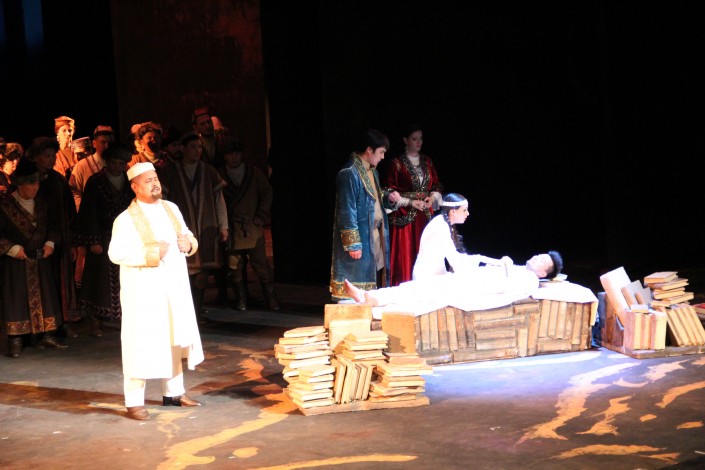 Триумфальная постановка оперы "Абай" состоялась в Тбилиси Сцена из оперы "Абай". Фото: Айнаш Ондирис