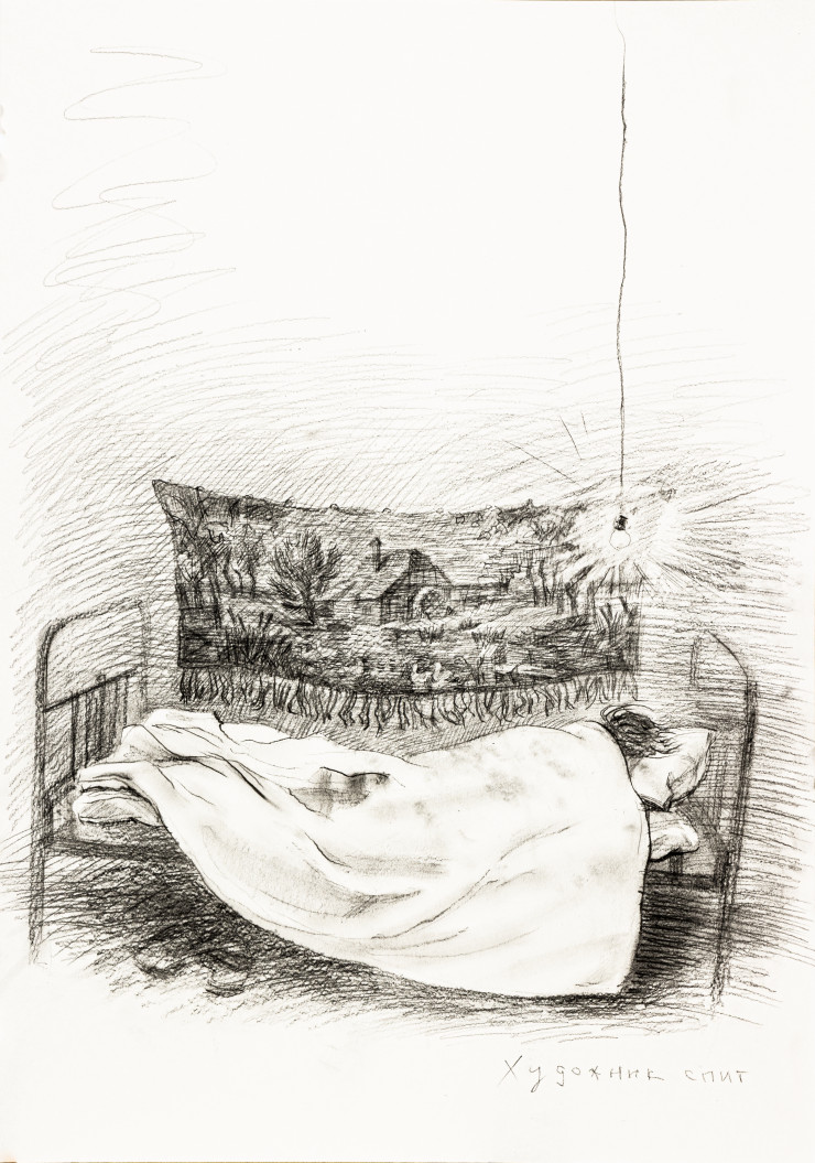 Елена и Виктор Воробьевы представили два проекта, которые родились в 1990-х годах. Два рисунка изображают известную инсталляцию арт-дуэта "Художник спит" (1996), которая выставлялась на Венецианской биеннале в 2017 году. А плетеный холст с изображением Виктора Воробьева за компьютером в 1998 году на курсах по веб-дизайну для художников, организованных Центром современного искусства Сороса, заставляет задуматься о сущности акта творения и о роли технологии в искусстве.