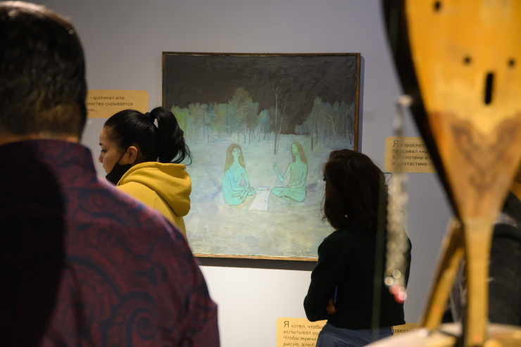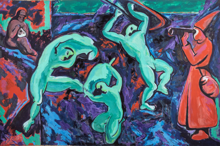 Работы рано ушедшего из жизни Молдакула Нарымбетова – художника-шамана, лидера группы "Кызыл трактор" ­-­ не показывались в Алматы уже много лет. На монументальном по размеру холсте Нарымбетов написал оммаж известной картине Анри Матисса "Танец". В композицию автор включил фигуры художников - соратников по "Кызыл трактору" Смайла Баялиева, Арыстанбека Шалбаева, Виталия Симакова, Саида Атабекова и самого себя - в процессе танца и музицирования, указывая на их собственные перформансы 1990-х годов, которые часто сопровождались шаманскими танцами и музыкой.
