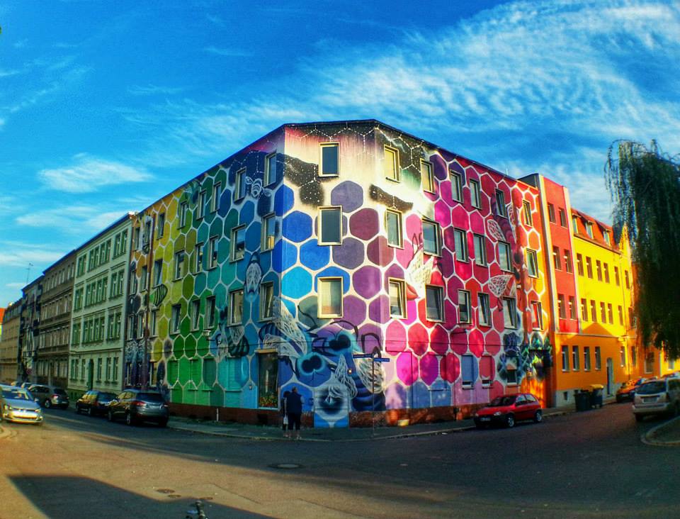 Отметим, что самая известная работа Марины Зуми - арт-волл "Соты жизни". Из обычной "бетонной коробки" в немецком городе Галле художница сделала огромную радужную фреску в виде пчелиных сот площадью 800 квадратных метров.