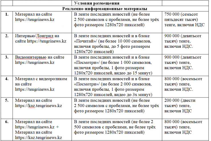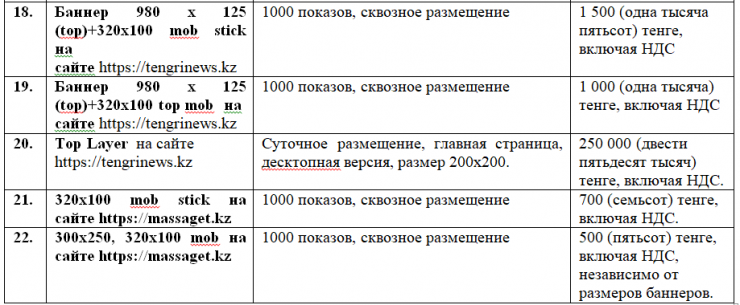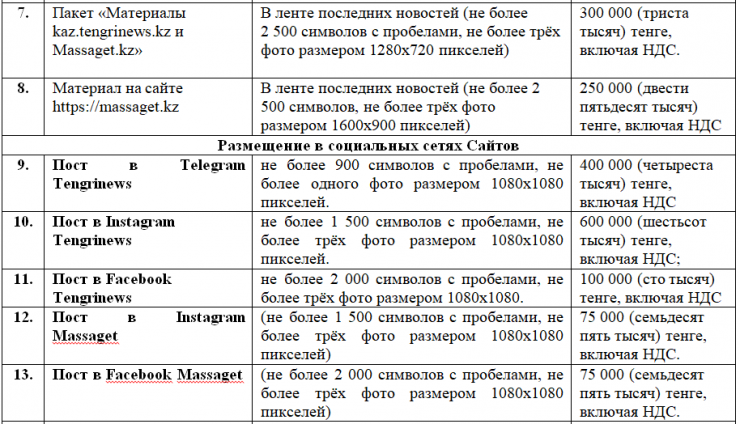Стоимость размещения агитационных материалов на Сайтах "https://tengrinews.kz/" и "https://massaget.kz/" составляет:
