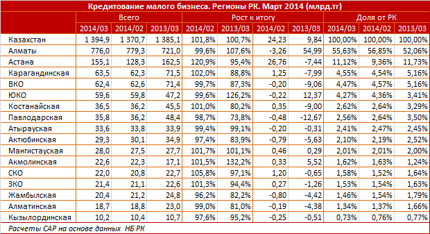 Более половины кредитов малому бизнесу выдается в Алматы. Так, небольшие предприятия в южной столице, по данным за март 2014 года, получили в кредит около 776 миллиардов тенге, сообщает Ranking.kz. На малый бизнес в других регионах Казахстана в совокупности приходится 618,9 миллиарда тенге.