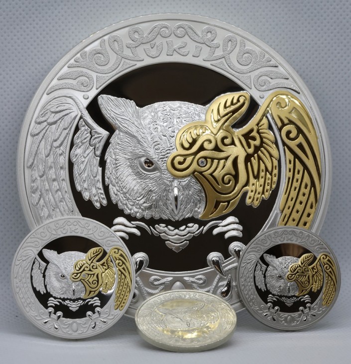 На лицевой стороне (аверсе) монет в обрамлении национального орнамента размещены год чеканки, номинал, товарный знак Казахстанского монетного двора и надпись, обозначающая металл, из которого изготовлена монета, его пробу и массу.  На оборотной стороне (реверсе) монет размещена композиция из натуралистического и трафаретного изображения головы филина с бриллиантовой вставкой, в верхней части монеты надпись UKI. По периметру монеты широкий кант с элементами декоративного оформления.