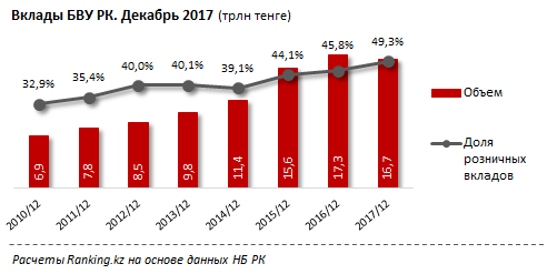 Объем вкладов за 2017 год впервые за несколько лет сократился - на 3,4 процента, до 16,7 триллиона тенге. Корпоративные вклады сократились на 9,7 процента, до 8,5 триллиона тенге, при этом розничные вклады продолжили рост - за 2017 год на 4 процента, до 8,2 триллиона тенге.
