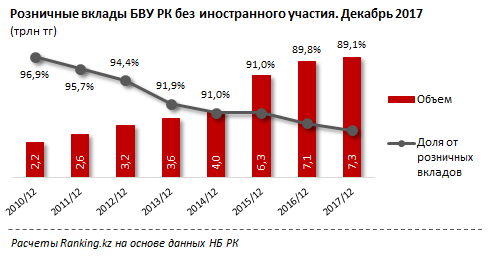 В то же время, несмотря на рост доли иностранных банков в объеме вкладов, 89,1 процента розничных депозитов все еще размещены в "полностью казахстанских" БВУ. Объем за 2017 год увеличился на 3,2 процента, до 7,3 триллиона тенге. В 2016-м годовой рост составил 13,4 процента.