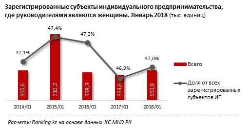 Из них 560,9 тысячи ИП находятся под руководством женщин - на 1,1 процента (6,3 тысячи) больше, чем годом ранее. Их доля от общего числа зарегистрированных ИП составила 47 процентов (годом ранее было 46,9 процента).