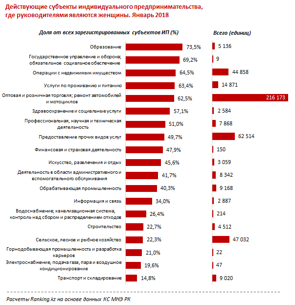 Аналитики сообщают, что самая высокая концентрация женщин-руководителей от всех действующих ИП - в сфере образования (73,5 процента - это 5,1 тысячи). Следом идут госуправление и оборона, обязательное социальное обеспечение - 69,2 процента (впрочем, это всего девять ИП), и замыкает топ-3 сфера операций с недвижимым имуществом - 64,5 процента (44,9 тысячи предприятий).