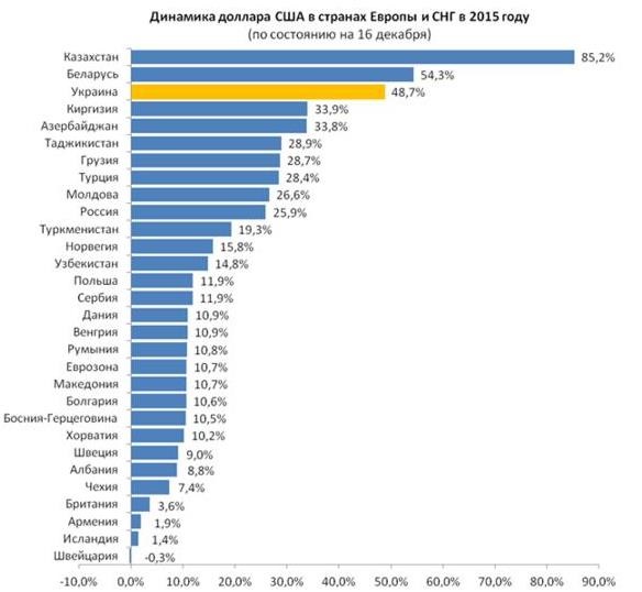 Как видно из графика, ни одна из валют стран СНГ не показала укрепление в 2015 году. Из европейских валют наибольшую девальвацию продемонстрировала норвежская крона - на 15,8 процента. Это произошло на фоне падения цен на нефть и газ на мировых рынках.