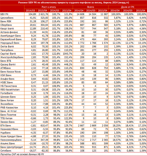 В тройку банков по месячному приросту также вошел и Сбербанк. Банк довел свой портфель выданных займов до 887 миллиардов тенге, месячная прибавка составила 20,6 миллиарда тенге. Как сообщается, банк вывел рыночную долю за шестипроцентный порог. Отмечается, что в целом за апрель 26 банков из 38 работающих в Казахстане увеличили объемы займов.