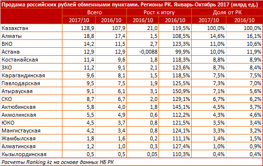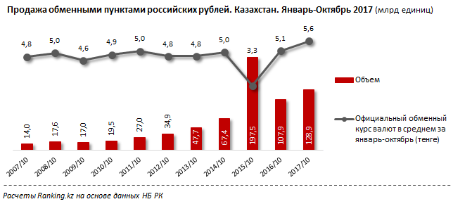 Объем продаж обменными пунктами российских рублей увеличился на 19,5 процента (21 миллиард рублей), до 128,9 миллиарда рублей, несмотря на то, что за год официальный обменный курс в среднем за январь-октябрь увеличился с 5,1 до 5,6 тенге за один рубль.