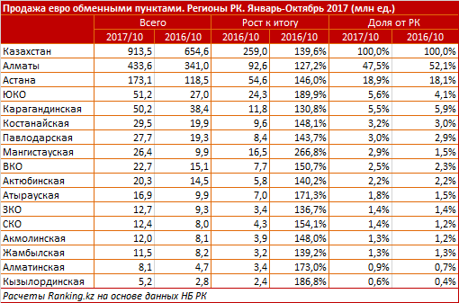 Лидирует Алматы с объемом проданных населению евро в 433,6 миллиона евро, рост за год на 27,2 процента (92,6 миллиона евро). Доля от РК уменьшилась за год с 52,1 процента до 47,5 процента.