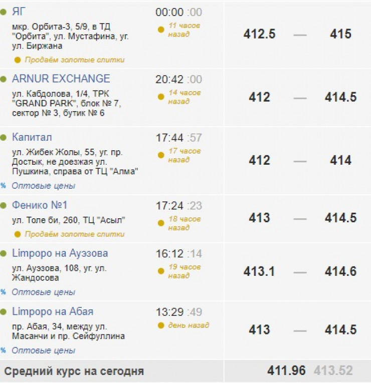 Отметим, что накануне утром доллар продавали в городе в среднем по 414,49 тенге.