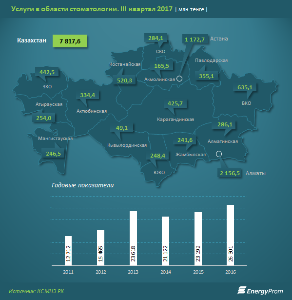 Всего по итогам третьего квартала расходы на услуги стоматологов достигли 7,8 миллиарда тенге - на 18 процентов больше, чем в аналогичном периоде прошлого года.