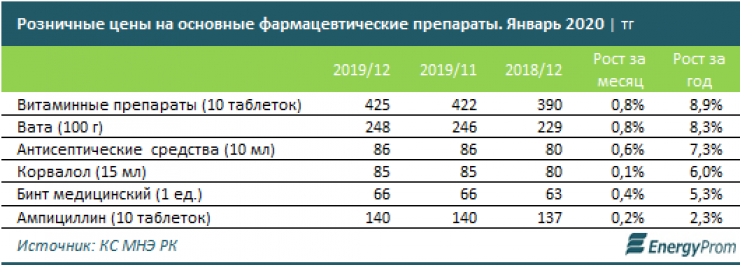 В целом цены на фармацевтические препараты по Казахстану за январь 2020 года выросли на 5,5 процента к январю 2019 года.