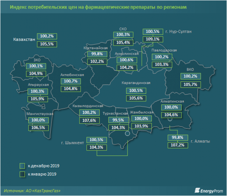 Среди регионов Казахстана больше всего подорожали лекарства в Нур-Султане: на 9,1 процента. Следом идут Кызылординская область (на 7,6 процента) и Алматы (на 7,2 процента). Годовое увеличение потребительских цен на фармацевтические препараты было зафиксировано во всех регионах страны.