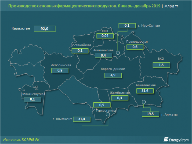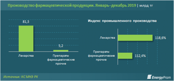 Производство непосредственно лекарственных препаратов за январь - декабрь 2019 года достигло 81,3 миллиарда тенге, прочих фармацевтических препаратов - 5,2 миллиарда тенге.