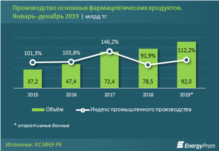 При этом отмечается, что производство основных фармацевтических продуктов за январь - декабрь 2019 года достигло 92 миллиардов тенге, это на 17 процентов больше, чем годом ранее.