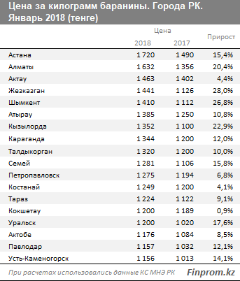 Самая высокая цена за килограмм баранины также в Астане - 1 720 тенге, рост за год на 15,4 процента.