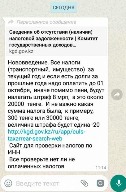 В Комитете государственных доходов Министерства финансов Казахстана назвали фейком распространяющуюся в мессенджерах информацию о якобы высоких штрафных санкциях за несвоевременную уплату налогов физическими лицами. Об этом ведомство сообщает на своей странице в Facebook.