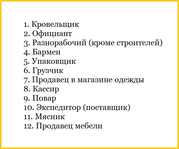 Только 25 процентов кровельщиков назвали свою работу "удовлетворяющей". Удивляет присутствие в этом списке таких людей, как повар, бармен и продавец в магазине одежды .