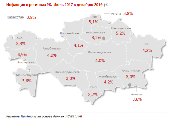 На третьем месте Карагандинская и Атырауская области. Здесь с декабря по июль 2017-го инфляция на продовольствие составила 5,6 процента.