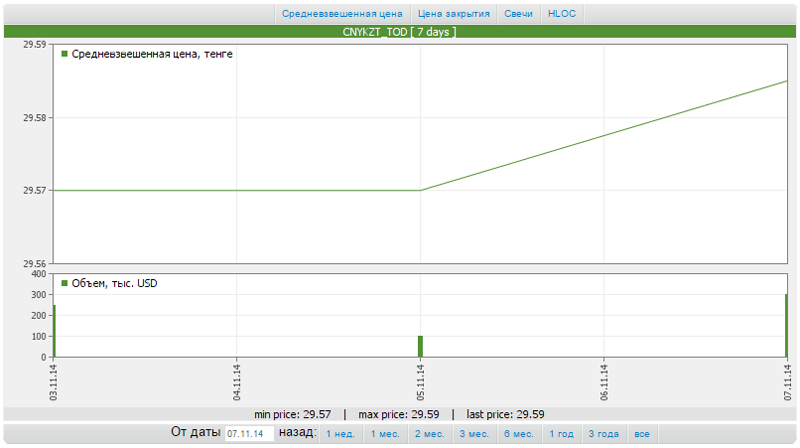 Позже торги по юаню опять не состоялись. Однако 7 ноября сделки по юаню были совершены на 300 тысяч (8,8 миллиона тенге). При этом отметим, что лучшие котировки на момент закрытия сессии на KASE составили 29,56/29,59 тенге за один юань.