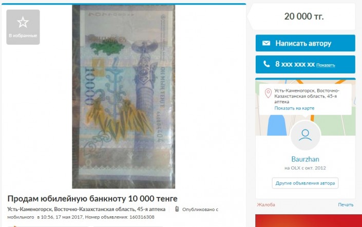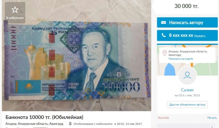 Стоимость юбилейной купюры на сайте Olx.kz варьируется от 13 до 55 тысяч тенге.