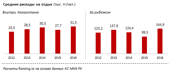 На фоне девальвации стоимость отдыха для казахстанцев за год выросла на 27 процентов. В 2016 году расходы на отдых в среднем на человека составили 49,5 тысячи тенге против 39 тысяч тенге годом ранее, сообщают аналитики Ranking.kz.