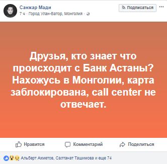 "Проблемы Банка Астаны уже отражаются на простых людях, когда они пытаются удовлетворить какие-то бытовые потребности. Сегодня картой банка не смог заплатить за комплексный обед в кафе, и наличности с собой не было", - поведал свою историю Олжаев.