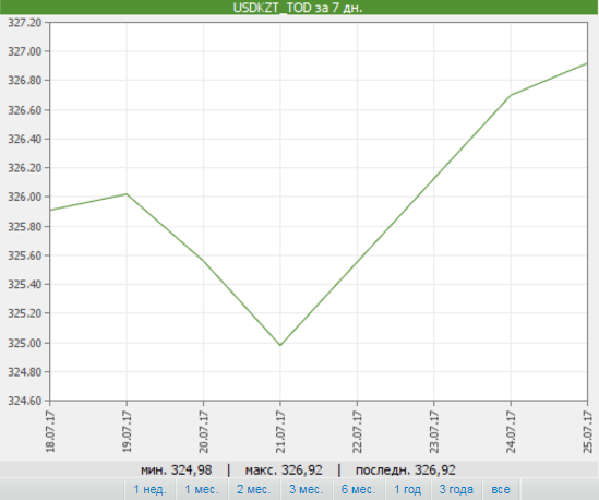 Курс нацвалюты составил  326,92 тенге за доллар по итогам утренних торгов на KASE 25 июля, передает корреспондент Tengrinews.kz. Таким образом, тенге ослабел еще на 22 тиына.