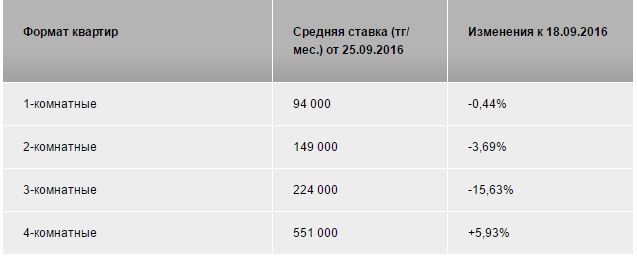 По результатам мониторинга рынка арендного жилья Астаны, за неделю, с 19 по 25 сентября 2016 года, средняя цена аренды квадратного метра остановилась на отметке в 2 313 тенге за квадратный метр. По информации аналитиков, снять квартиру в Астане предлагают в среднем за 189 тысяч тенге в месяц. За неделю ставка снизилась на 19,08 процента.