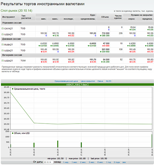 Сегодня, 20 октября, объем торгов долларом на KASE составил около 1,3 миллиарда. Во время утренней сессии на бирже было продано 710 миллионов долларов,  во время дневной сессии - 503,9 миллиона долларов и вечерней - 64,5 миллиона долларов. Для сравнения отметим, что в пятницу, 17 октября, на KASE было продано чуть меньше 500 миллионов долларов