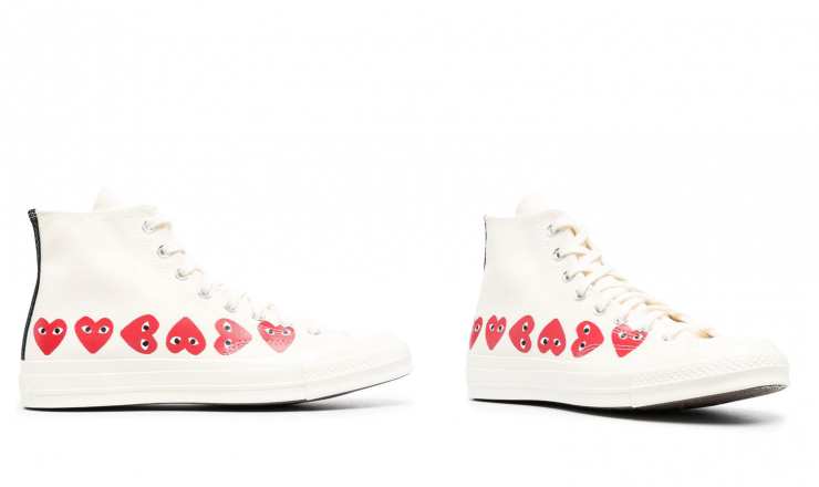 Классические кеды Converse никогда не выйдут из моды, однако мы предлагаем обратить внимание на коллаборацию с французским брендом Comme DES Garcons. Высокие белые кеды, украшенные логотипом бренда (в виде сердца), – отличный подарок на 14 февраля.