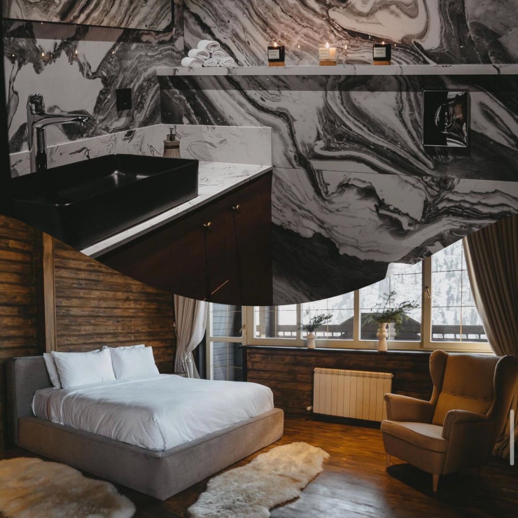 Интерьеры домов также выполнены согласно новым веяниям моды: стильный скандинавский интерьер, модная дизайнерская мебель, дорогая сантехника, пушистые ковры и необычные интерьерные детали - идеальное место для создания эстетического контента, такого модного в Instagram и Tik-Tok. В каждом шале можно найти 3 спальни с собственными выходами на террасу, 5 санузлов, бассейн, сауну, оборудованную кухню, обеденный стол на 8 персон и зону барбекю.