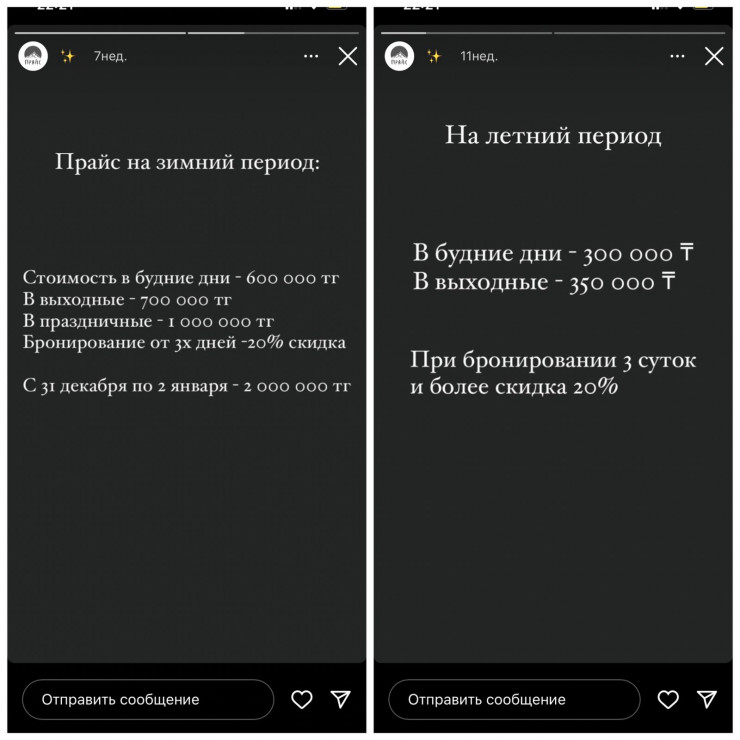 Однако прайс, выставленный на официальном аккаунте загородных домов в Instagram, заставляет брови ползти вверх: если в летний период в выходные дни здесь можно остановиться за 350 тысяч тенге в сутки, то в зимний сезон ночь обойдется в 700 тысяч тенге, то есть в 2 раза дороже. В новогодние праздники (с 31 декабря по 2 января) владельцы просят с постояльцев рекордные 2 миллиона тенге.