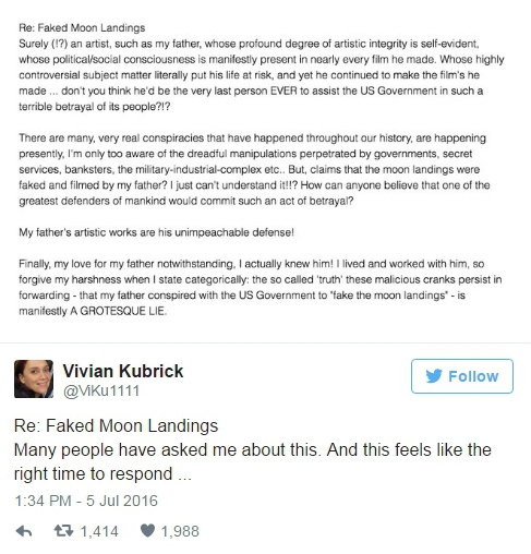 Дочь всемирно известного американского режиссера Стэнли Кубрика ("Тропы славы", "Спартак", "Космическая одиссея 2001 года", "Заводной апельсин", "Сияние", "Цельнометаллическая оболочка") опровергла популярную теорию заговора, согласно которой высадка американцев на Луну в 1969 году была подделкой, а ее отец якобы принимал непосредственное участие в фальсификации. На своей странице в Twitter Вивиан Кубрик впервые после смерти режиссера публично выступила против теории "лунного заговора".