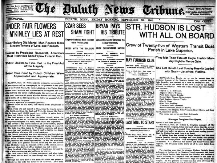 Первая полоса газеты Duluth News Tribune от 20 сентября 1901 года, где сообщается о крушении "Хадсона". © mprnews.org