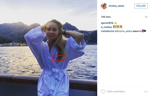 Кроме этого, глава ФБК приводит фото дочери Навки Александры, которая выложила в своем Instagram фото в халате с надписью, напоминающей название яхты.