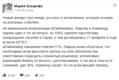 "На мюнхенской конференции Штайнмайеру, Лаврову и Хэммонду задали один и тот же вопрос: из 100 процентов оцените перспективы прекращения насилия в Сирии, о чем договорились 11 февраля в ходе встречи МГПС. Штайнмайер лаконично ответил 51 процент. Лавров начал объяснять, что необходимо всем выполнять взятые на себя обязательства, ответственно подходить к принятым решениям, коллективно взаимодействовать по вопросу урегулирования, а так как в этом есть сомнения, дал 49 процентов. Хэммонд сказал, что во всем виноват Кремль", - написала Захарова.
