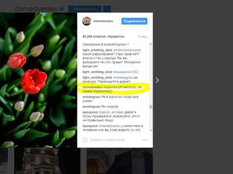 Между тем сам премьер-министр России Дмитрий Медведев на своей странице в Instagram ответил пользователю, чем был занят в день массовых митингов. На вопрос комментатора под ником ispiridonoff: "Привет! Как день?", глава правительства ответил: "Неплохо, на лыжах покатался", а в конце сообщения поставил смайлик с высунутым языком, пишет "Московский комсомолец".