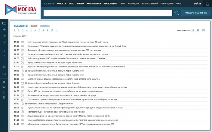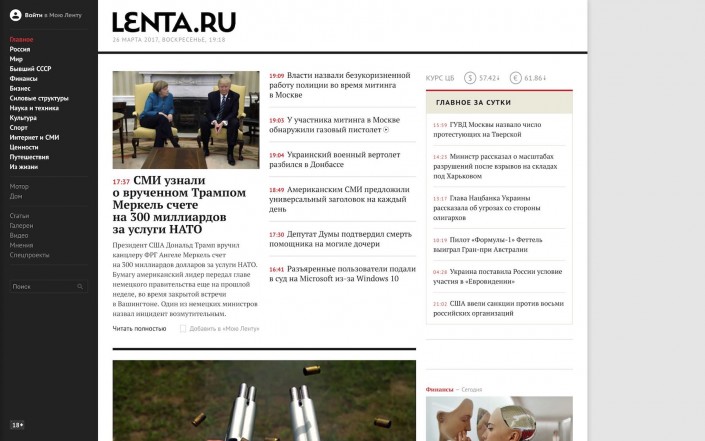 Сайт канала RT в 18.28 сообщил о 500 задержанных, а в 19.07 - о пострадавшем полицейском. На главной странице Lenta.ru появились целых три новости о митингах в Москве: о безукоризненной работе полиции, о газовом пистолете, обнаруженном у одного из протестующих, и о том, что МВД назвало число участников акции (без указания этого числа).