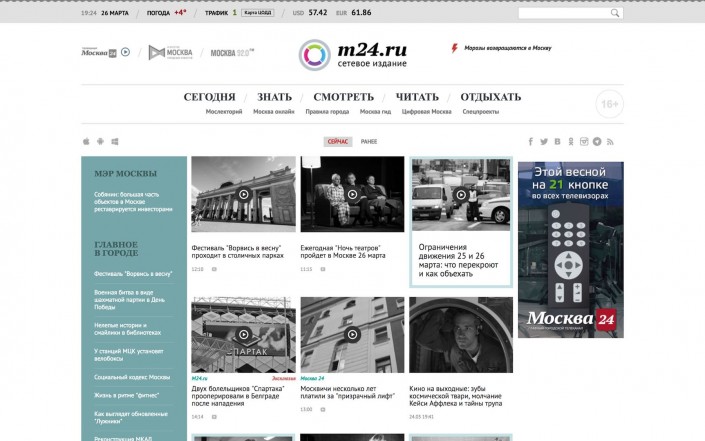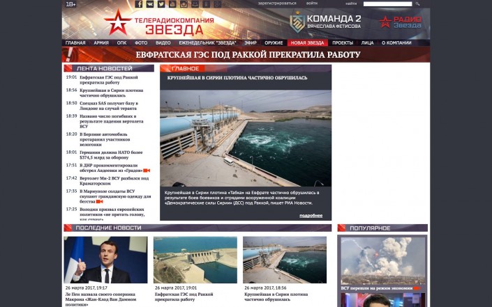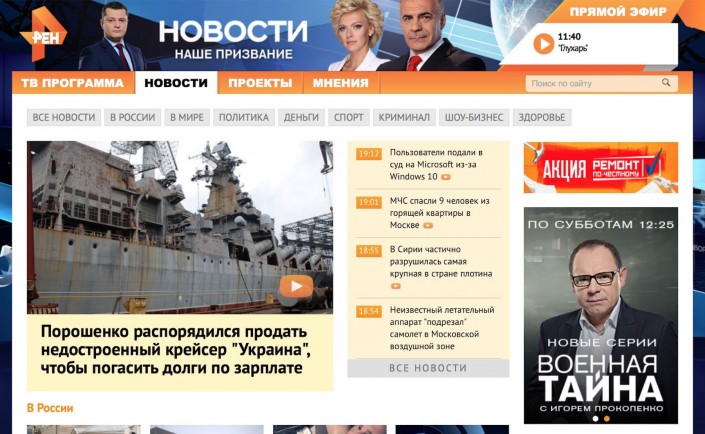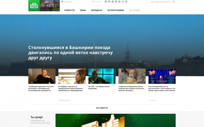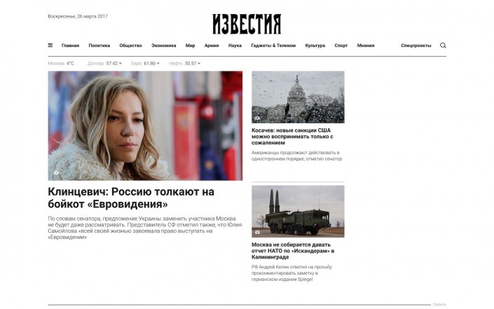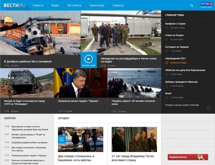 Так, сайт телеканала "Россия 24" сообщал о событиях в Донбассе и нападении на бойцов Нацгвардии в Чечне, совершенном накануне. "Российская газета" писала о столкновении поездов в Башкирии. А сайт НТВ предлагал посмотреть интервью с Андреем Колесниковым и сюжет о "Евровидении".