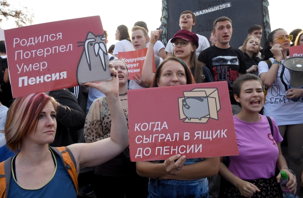 Несогласованная акция против внесения изменений в пенсионное законодательство проходит в центре Москвы в воскресенье.
