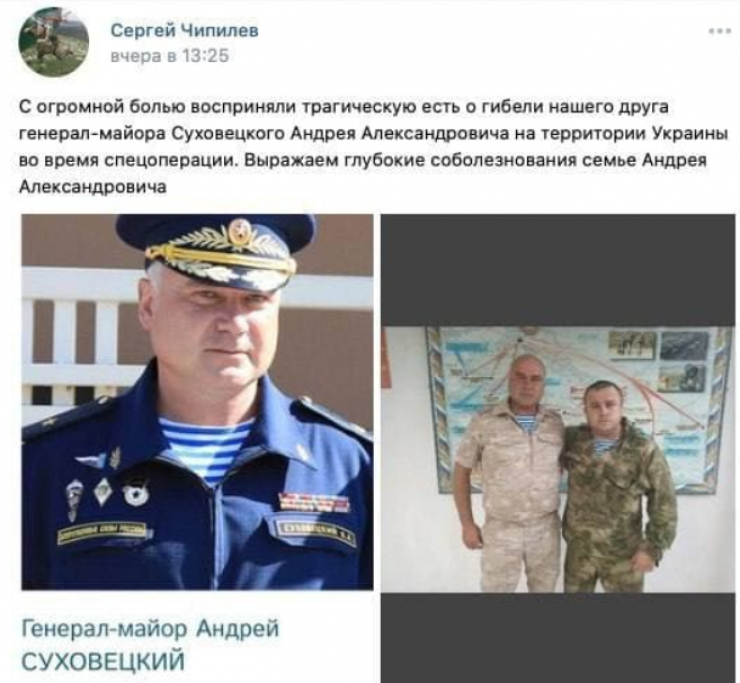 "С огромной болью восприняли трагическую весть о гибели нашего друга генерал-майора Суховецкого Андрея Александровича на территории Украины во время спецоперации. Выражаем глубокие соболезнования семье Андрея Александровича", - написал он.