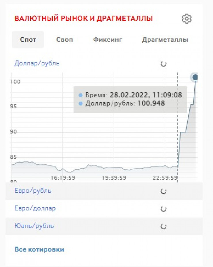 Известно, что Банк России в первый день объявленных валютных интервенций, 24 февраля, продал на рынке валюту на 84,8 миллиарда рублей.