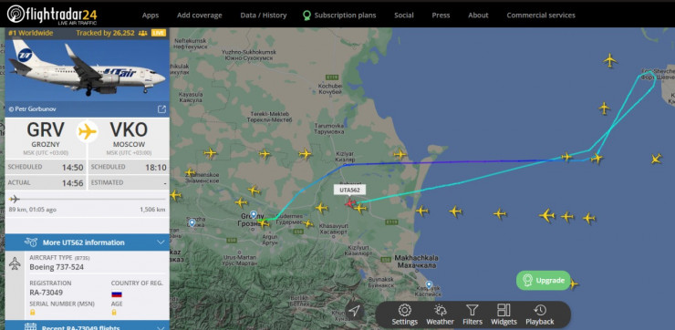 "Что-то странное с Boeing 737 Utair Грозный - Москва. Рейс UT562 сначала подал сигнал бедствия, развернулся и пропал с радаров. Но через несколько минут он снова появился - недалеко от побережья Каспия", - говорится в сообщении Telegram-канала.